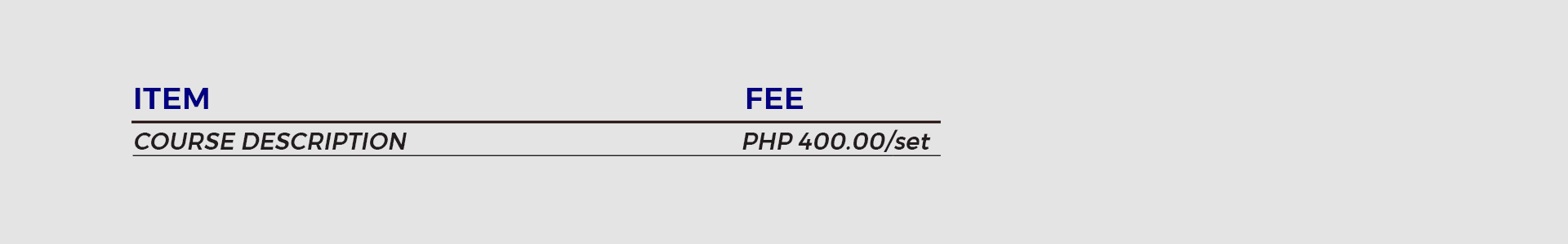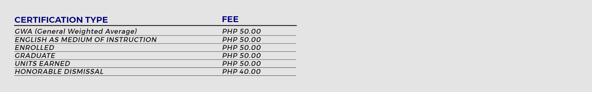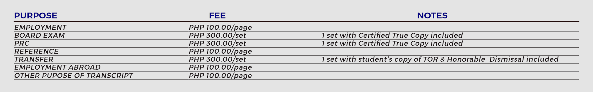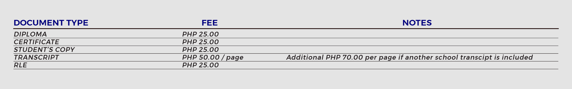 NOTE: If there is another school transcript in the student’s record, an additional of PHP 70.00 per page will be charged.