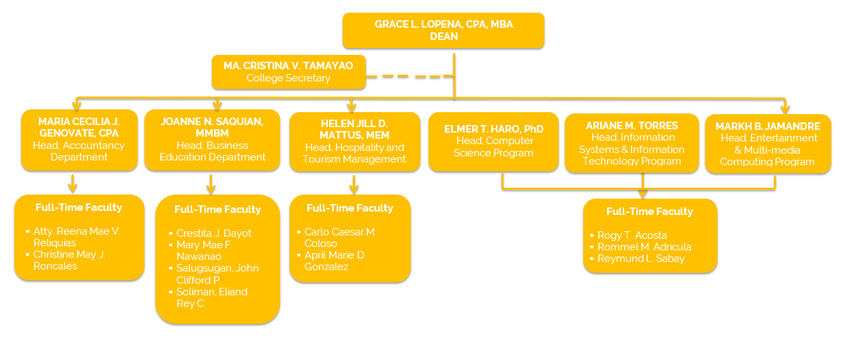 The College of Business and Accountancy envisions itself to be the Cradle of Excellence for Accountancy, Business Education and Hospitality Management. It foresees its graduates to become globally competent leaders, managers, businessmen and professionals who carry out the values of Service and community life, Interiority, Marian moral integrity, Peace and justice, Love, and the passion for Excellence. It also envisions to be a provider of functional, authentic, value-oriented, and research-based business education in the country adhering to the National Competency and Industry-based standards.