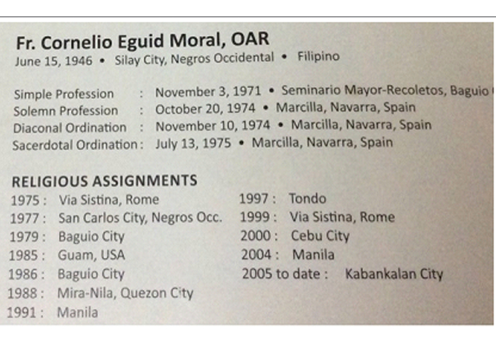 Padre Moral was mindful of his duty, dedicated to his work. He was always the early bird in the capilla. Time is gold for him. Seldom came late in an appointment. There is that European influence in him in terms of time management. Something that is admirable to him.